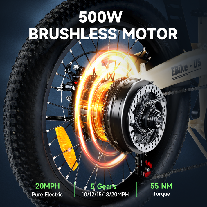 Ride smarter and farther with the U5 Electric Bike, engineered for power, efficiency, and comfort. Equipped with a robust 500W motor and UL-certified 375Wh battery, this e-bike is built to handle your daily commute and weekend adventures with ease. With a 20-inch wheel design and IPX4 water resistance, it’s perfect for all types of terrain and weather conditions.